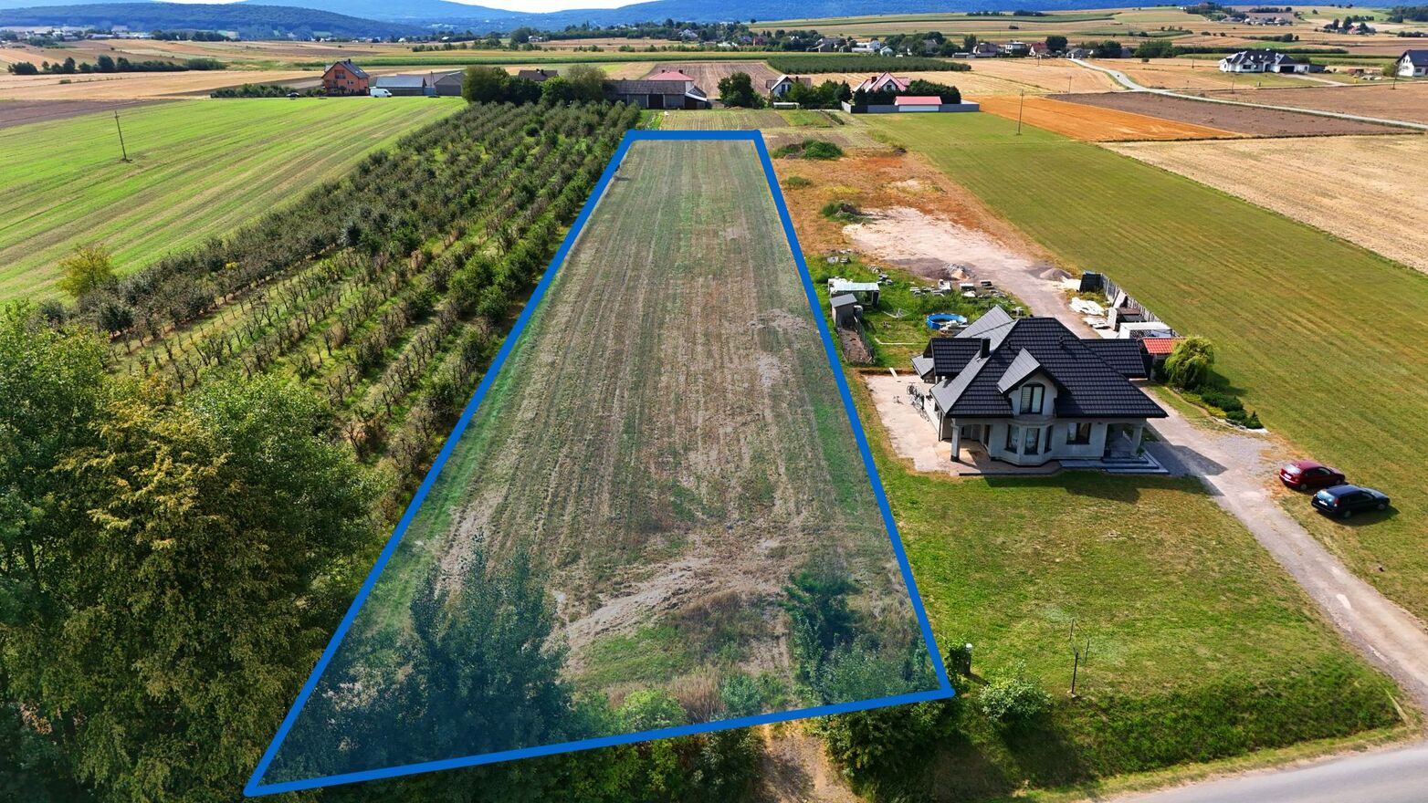 Działka ma kształt prostokąta o szerokości frontu 28,6m i długości ok. 204m. Od strony frontowej posiada bezpośredni dostęp do drogi asfaltowej, co zapewnia komfortowy dojazd zarówno samochodem osobowym, jak i większymi pojazdami.